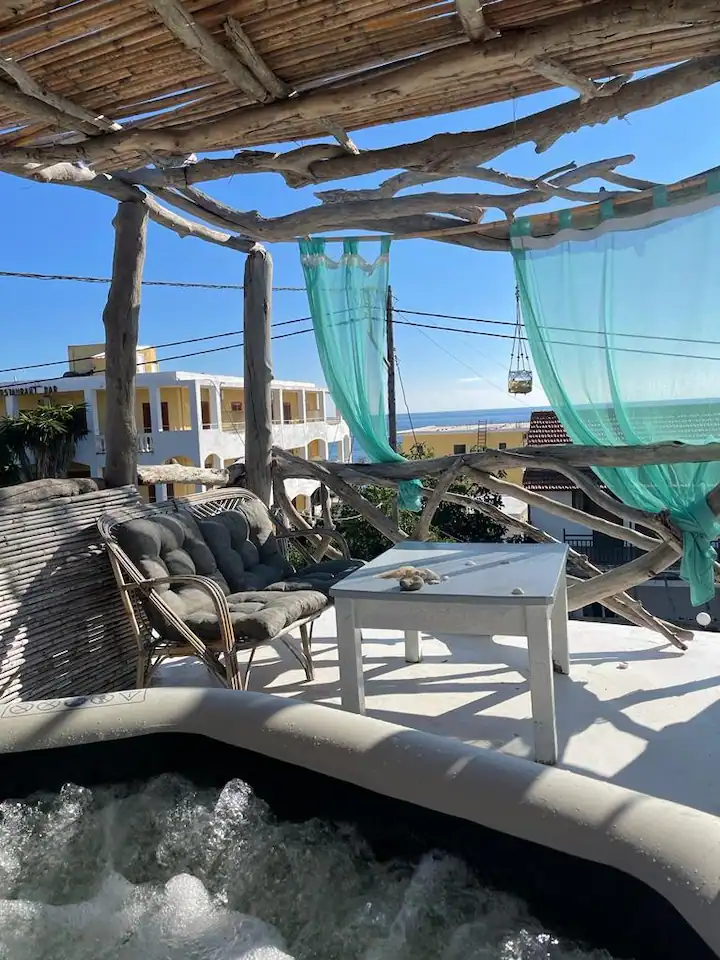 4 kambariai, svetainė, 2 vonios kambariai, jacuzzi. Gali apsistoti iki 10 asmenų.